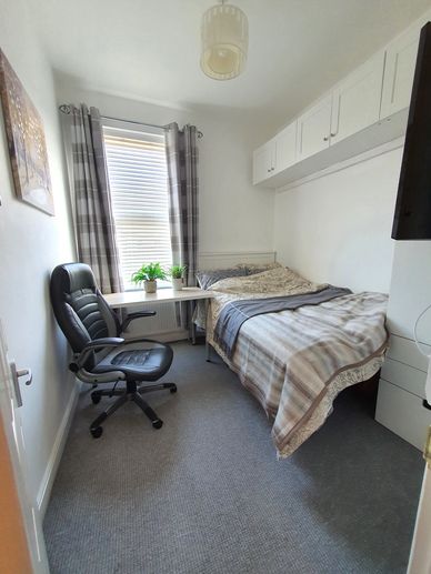 Double Bedroom. Situated to the back of the property, comprising, 32 inch 4K Smart TV with HDMI socket which is hardwired to the internet, at the desk is hardwired internet with double electrical socket and usb charging, large window overlooking the back garden, double bed, large desk, office chair, black out curtains, two door wardrobe with drawers. overbed cupboards, underbed drawer, Wifi throughout the house.