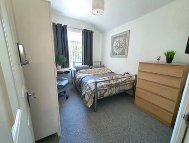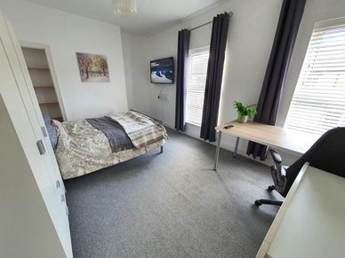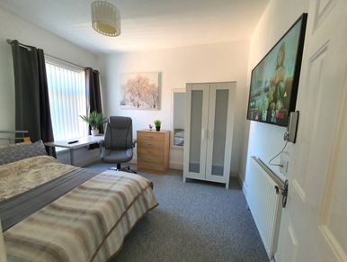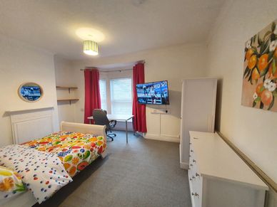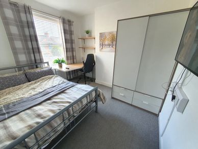 Large. 50 Inch 4K Smart TV, double bed large desk and leather office chair and filing cabinet. tall wardrobe with drawer. Long mirror. Venetian blinds and blackout curtains.