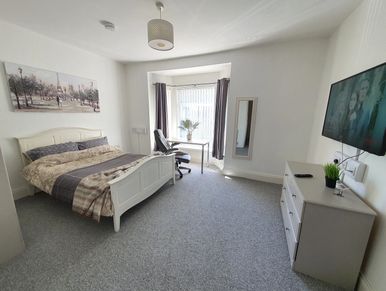 Large Double. Modern bedroom with 50 Inch 4K Smart TV, hardwired ethernet for gaming etc, white furniture, double bed, triple wardrobe with drawers large desk, office chair, blinds and blackout curtains.