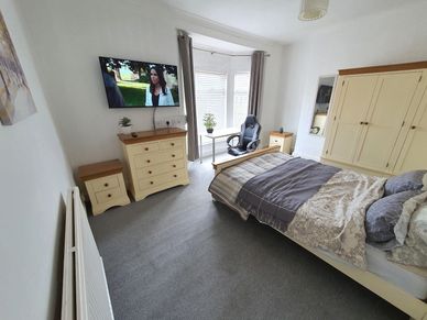 Very Large Double. Situated to the front of the property, comprising, 50 inch 4K Smart TV with HDMI socket which is hardwired to the internet, at the desk is hardwired internet with double electrical socket and usb charging, large windows overlooking the front double bed, large desk, office chair, black out curtains, three door wardrobe, chest of drawers. Wifi throughout the house.