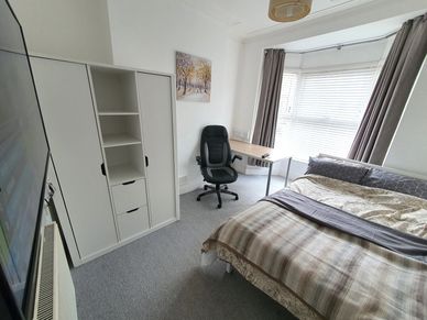 Large Double. Modern bedroom with 50 Inch 4K Smart TV, hardwired ethernet for gaming etc, white furniture, double bed, wardrobe with drawers large desk, office chair, blinds and blackout curtains..