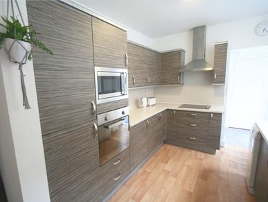 Modern kitchen with dishwasher, built in fridge freezer, electric oven with grill, ceramic hob, Bosch washer dryer, extractor fan, kettle, toaster, built in microwave.